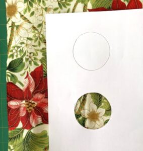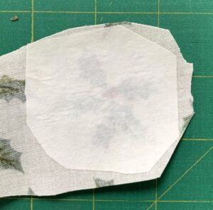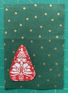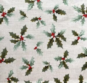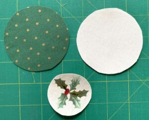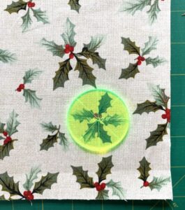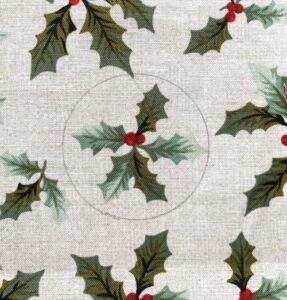 We used this holly print fabric for our round tag, as there was a variety of holly sprigs of different sizes, and they were spaced fairly openly, which meant we could easily fussy cut a single sprig.