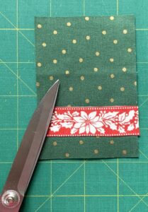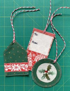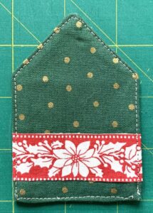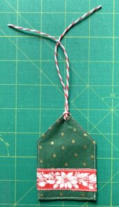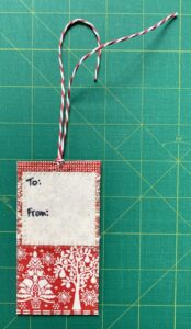 You could sew this in place, but as it’s just a small tag, we used a scrap of fusible webbing (for applique) and just fused the poinsettia strip to the front of the tag.