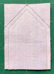 And sew up one side, up to the point, and back down the other side. We used a 1/4 inch seam, and sewed inside the marked point as pictured.