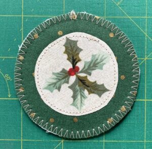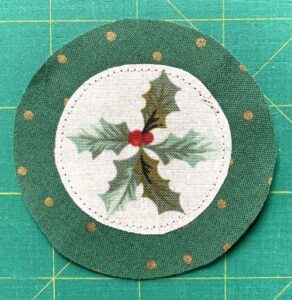 Fuse the fussy cut holly to the front fabric, and topstitch to secure it.