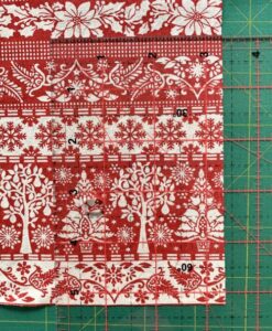 We cut the strip, and arranged it so the main flower was centered, and down towards the bottom our tag. (Don’t go right to the bottom, as you need to leave a seam allowance.)