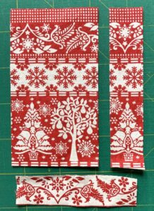 We went back to the busy Christmas print, and decided as it was in rows, that we could just cut a rectangle straight from it, for our third tag.