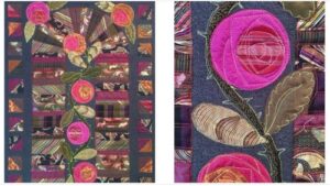 Julia’s own quilts show a great variety too, from her quilted roses above, to this striking quilt made from a silk Indian saree below.