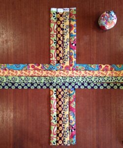 Carefully weave the strips together where they overlap in the centre, and place a small fusible webbing square between the layers.