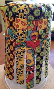 To make each row, use one of your half strips and carefully wrap it around the vase at the top where the base weaving stops. This will be your first row up the side of the fabric Easter egg basket and needs to fit snugly to suit the woven base.