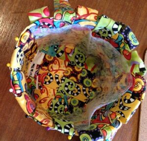 Place the lining into the basket and tuck under the top raw edge so the lining sits just below the woven outer basket edge.