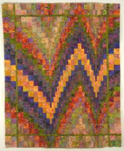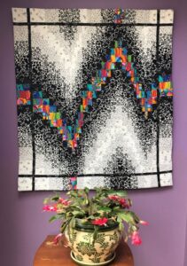 Cindy shared a couple of suggestions for how to quilt your bargello wall hanging, and showed a few examples of other finished bargello quilts too. This green and purple quilt below was made to the same pattern as her black and white “Fire and Ice” class quilt, and you can see how dramatic an effect choosing different fabrics can have.