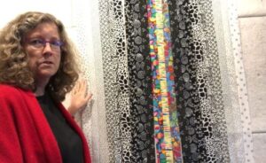 As Cindy demonstrates, making these bargello quilts is not a matter of cutting a bunch of teeny tiny pieces, but cutting strips, then cleverly manipulating those pieced strips into the bargello design.