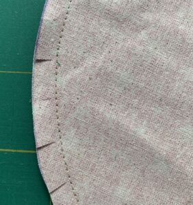 With your needle and thread (we used a doubled thread for ours), make a knot or stitch a small backstitch to secure the end then bring the needle through the very edge of the circle, at the folded point, as pictured.