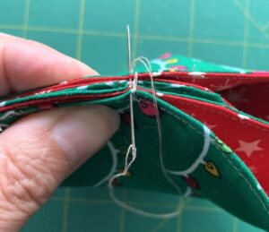Bring your needle down, and again, go through the outer edge of the fabric (from the outside to the inside as shown), at the fold.