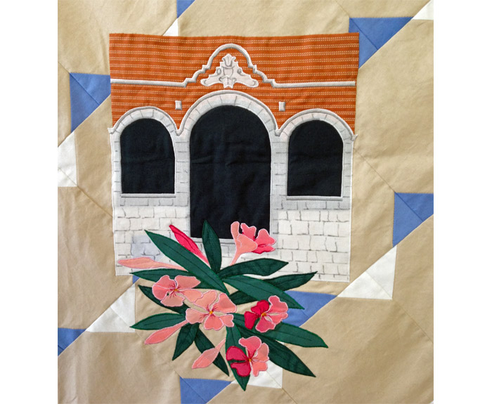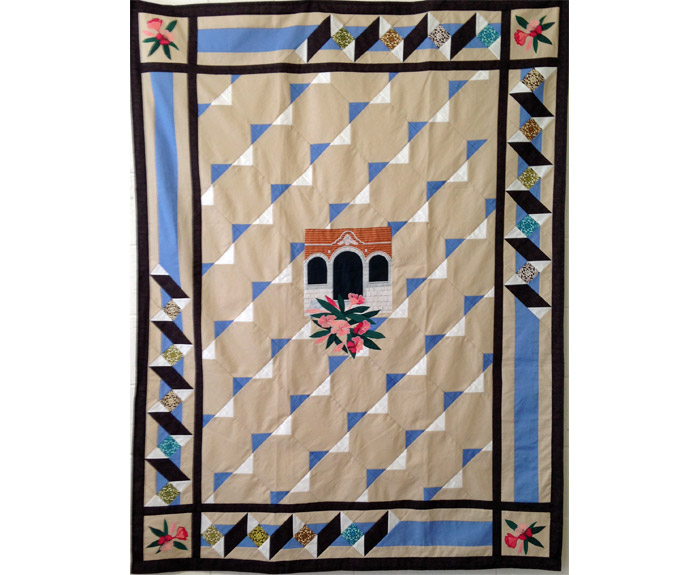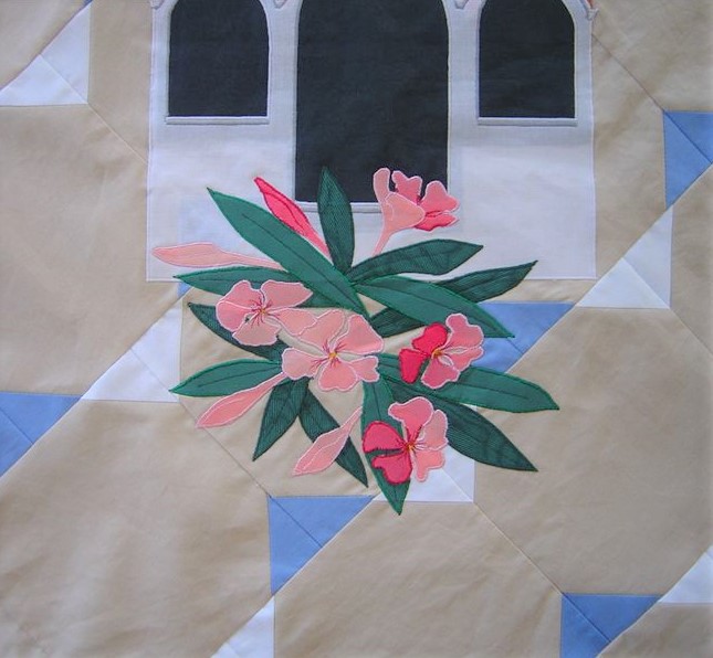 No trip to the Houston Quilt Festival would be complete without a visit to Galveston. Our quilt is based on one of Galveston’s most beloved historic houses, the Moody Mansion. The veranda tiles inspired this quilt, and the grand front entry and stunning oleander flowers feature strongly. The oleanders are as much a symbol of Galveston as is this historic home. This quilt incorporates piecing, foundation piecing and applique.
