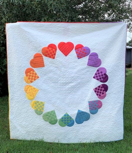 This is a bright and happy quilt if you love the rainbow colours, and the plain background also gives plenty of room for some fun negative space quilting too. The woven hearts are easy to make, and give such a great effect.